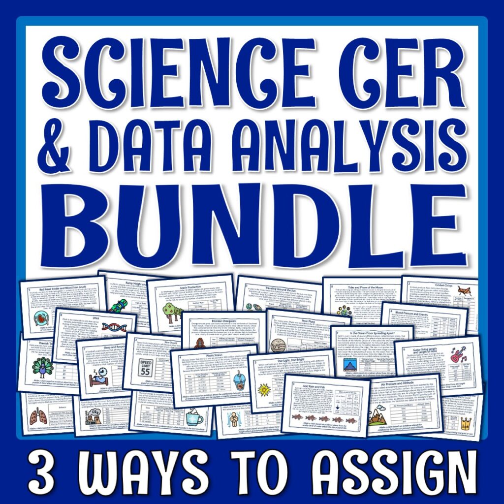 Need a meaningful way for early finishers to strengthen their scientific thinking skills? Keep these CER (Claim, Evidence, Reasoning) task cards ready to go. Each card presents students with a brief science scenario and a simple data table – no science background knowledge needed. When students finish early, they can grab a card, analyze the data, and practice writing claims based on evidence. Since there are 24 different scenarios covering topics from fish growth to gravitational potential energy, students can work through new challenges each time they finish early. Keep a folder of response sheets by your desk where students can record their CER responses. What I personally love about these cards is that because they focus only on scientific thinking rather than content knowledge, they work as fast finisher activities any time during the year, regardless of what unit you’re teaching.