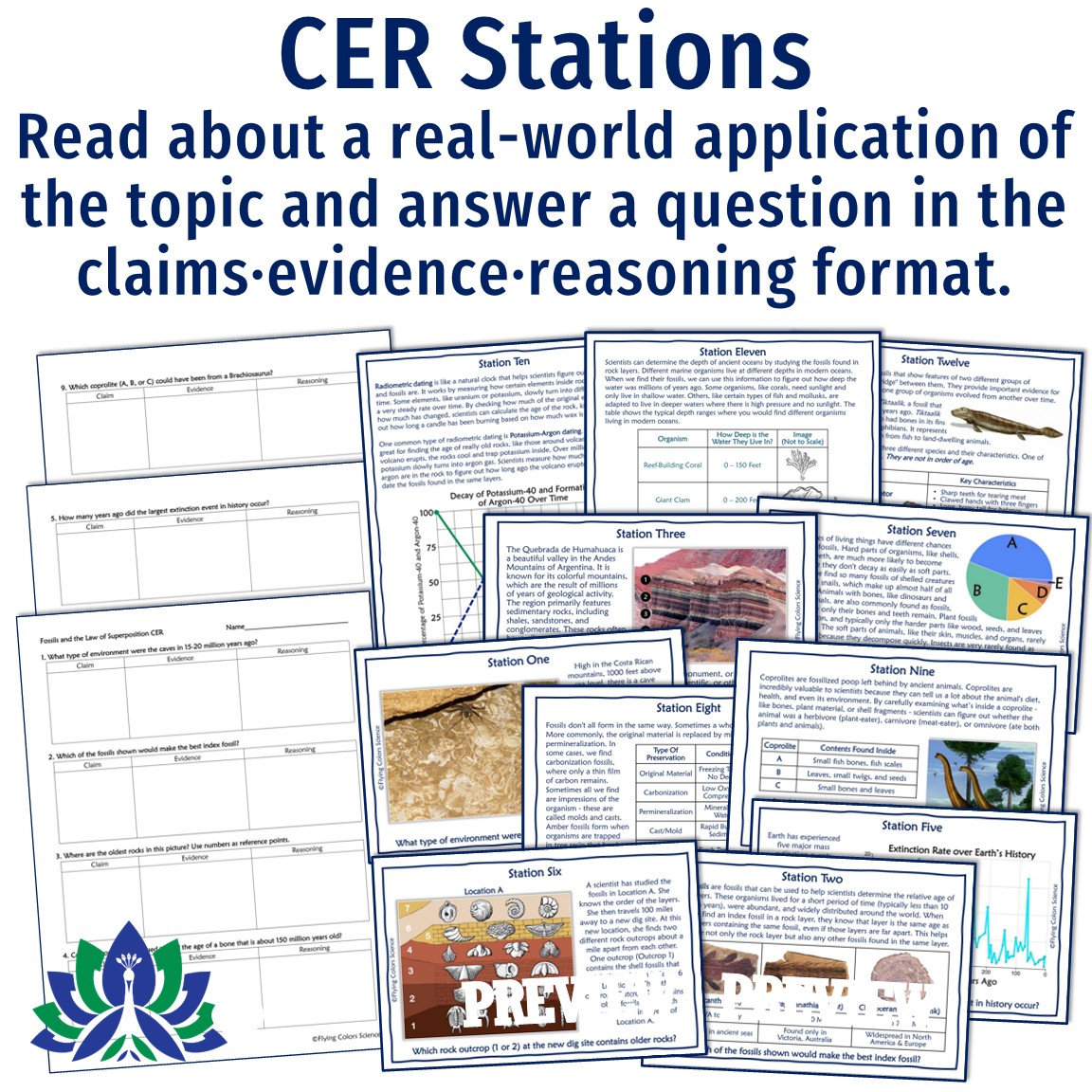 - CER & Data Analysis Stations*: RIGOROUS! Spark some critical thinking with claims, evidence, and reasoning practice! Review and reinforce fossils and the law of superposition with 12 CER task cards.