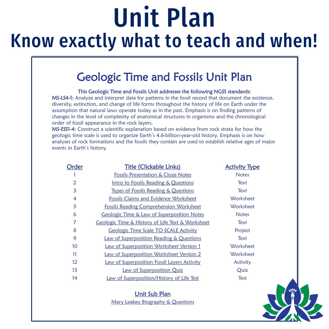 - Unit Plan: Know exactly what to cover and in what order!