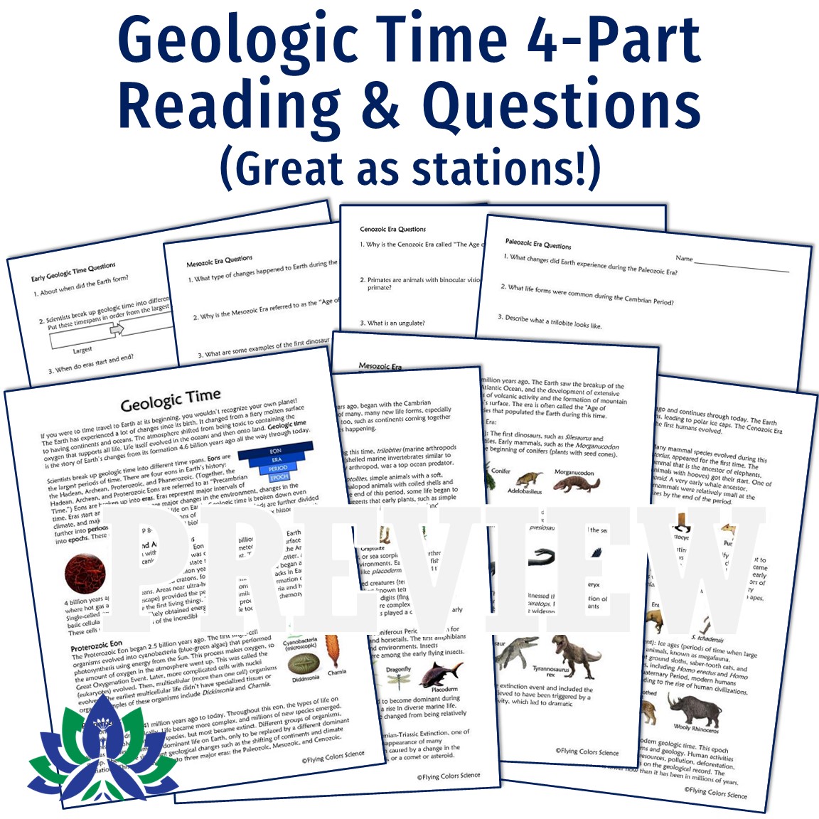 - Geologic Time Guided Reading or Stations*: Learn about how scientists break up geologic time into eras and periods and discover the different forms of life as they evolved through Earth’s history. Each era has its own page of questions so the reading can be broken up easily or done in stations.