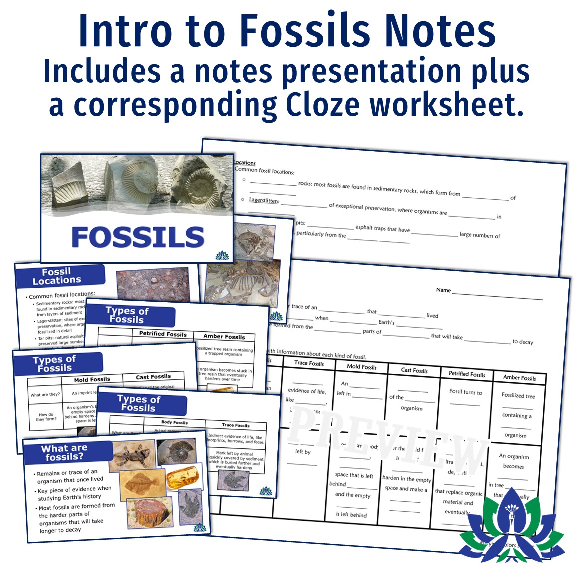 - Notes Presentations (2)*: These presentations cover fossils and geologic time. Each presentation comes in PPT and Google Slides, and each has a corresponding Cloze worksheet for students to complete as they take notes.