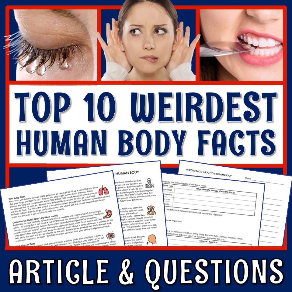 Students READ an engaging article about 10 weird human body facts then ANSWER QUESTIONS on a corresponding worksheet. Great as a science sun plan!!