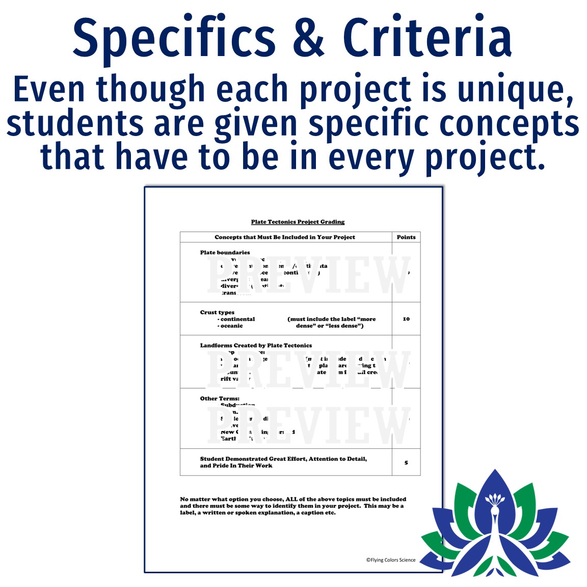 Students are given the concepts that must be included in their project, including topics in the following categories: